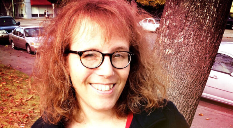 Julia Serano smiling outdoors near a tree, wearing glasses and a black coat with a red top, parked cars behind her.